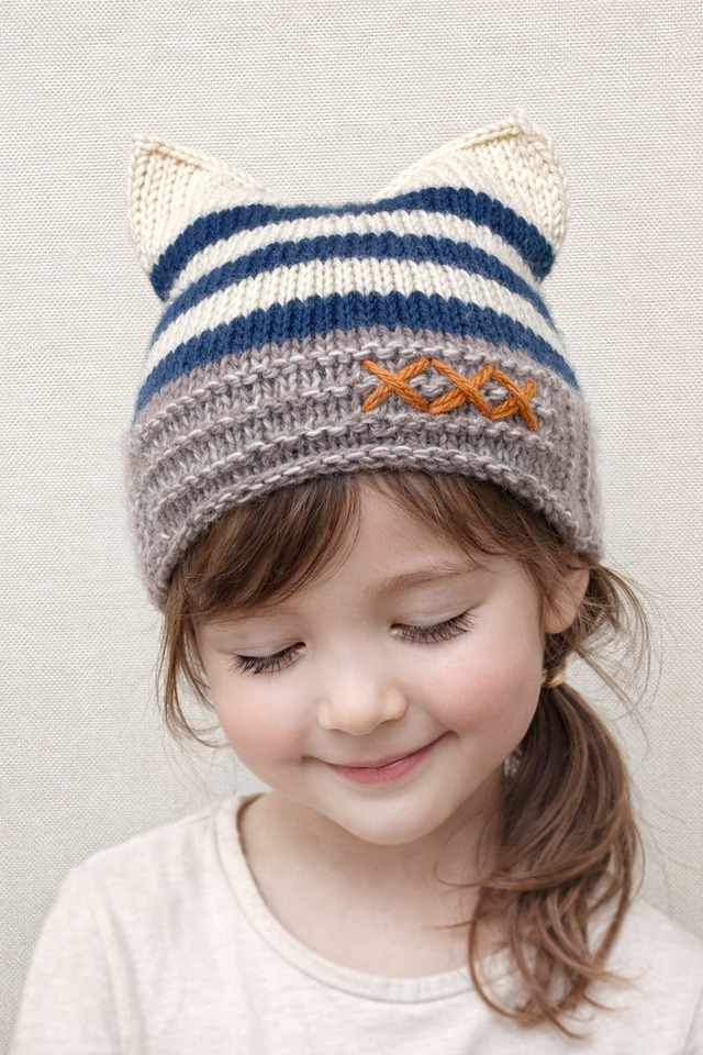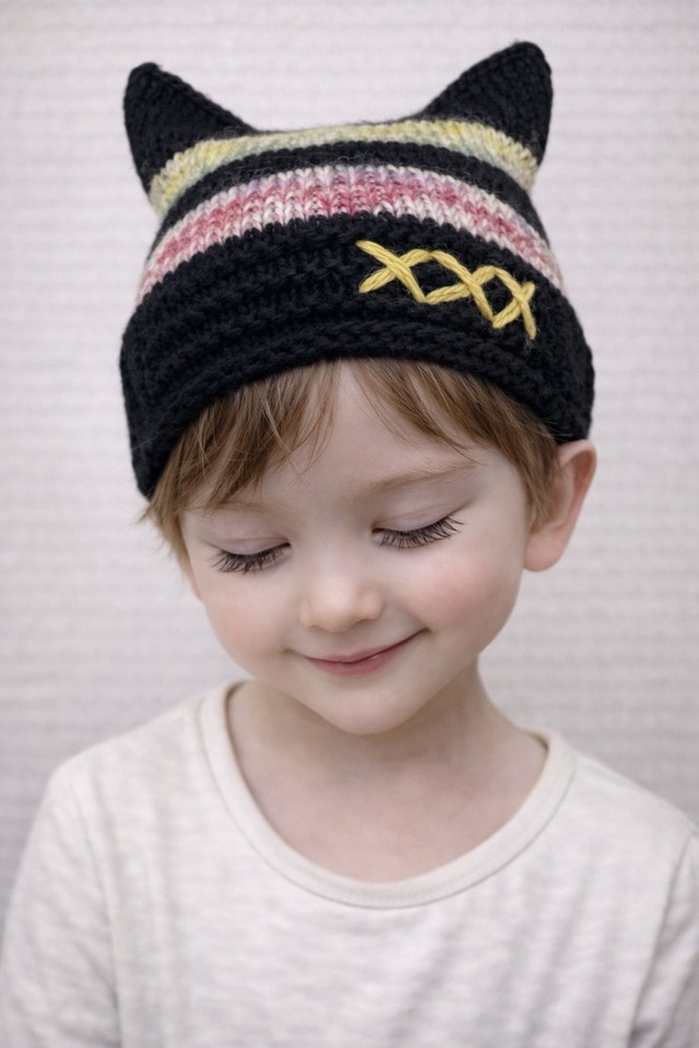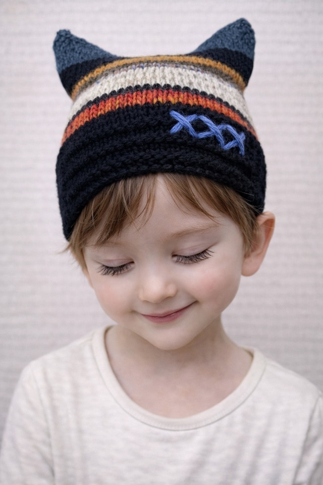 寒い日の外出に、さっと被れる猫耳ニット帽です。 通園・お散歩・写真を撮る日に使いやすいデザインです。 子どもが「これにする」と選びやすいように、 締め付けすぎず、軽い被り心地で編みました。 ニットならではの伸縮性があります。 ご自宅で手洗いできます。 子ども向けのサイズ感で編んでいますが、 伸縮性があるため、 頭囲の小さめな大人の方にも着用いただけます。 こちらは手編みの一点もの・【即納】商品です。 【デザインについて】 猫耳の形には2種類あります。 それぞれ雰囲気や、きれいに形が出やすいサイズ感が異なりますので、 写真とあわせてご確認ください。 【ニョキ耳タイプ】 耳が立体的に立ち上がるデザインです。 頭のサイズが小さめのお子さまでも、 耳の形が出やすいのが特徴です。 【フラット耳タイプ】⭕️ 耳がフラットに立つデザインです。 頭のサイズがしっかりしてくる 小学生高学年〜くらいのお子さまの方が、 シルエットがきれいに出やすい傾向があります。 ※頭のサイズが小さい場合、 フラット耳タイプは 全体がやや四角い印象になることがあります。 【サイズ・素材・カラー・お手入れ】 サイズ: 頭囲 約40〜60cm(伸縮性あり) 奥行き 約20cm ※子ども〜頭囲小さめの大人の方まで対応 素材:ウール・アクリル・キッドモヘア カラー:段染め×オフホワイト、ブラックのボーダー (イエロー刺繍入り) お手入れ: 手洗い推奨/平干しで形を整えて乾燥 【発送について】 こちらは【即納】商品です。 ご注文後、準備が整い次第発送いたします。 #猫耳ニット帽 #猫耳帽子 #キッズニット帽 #子ども帽子 #ハンドメイドニット #手編み帽子 #冬のお出かけ #通園コーデ #キッズファッション