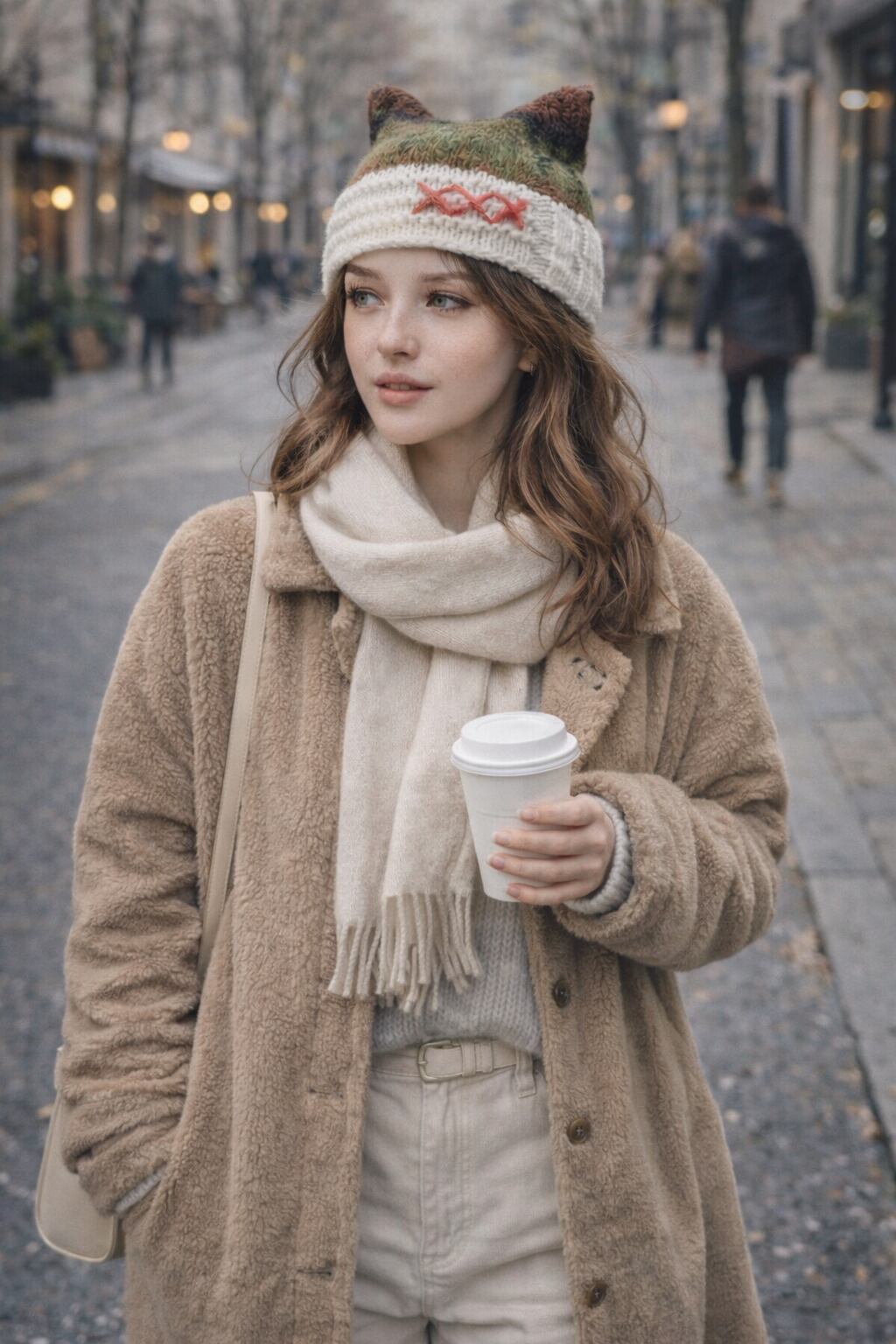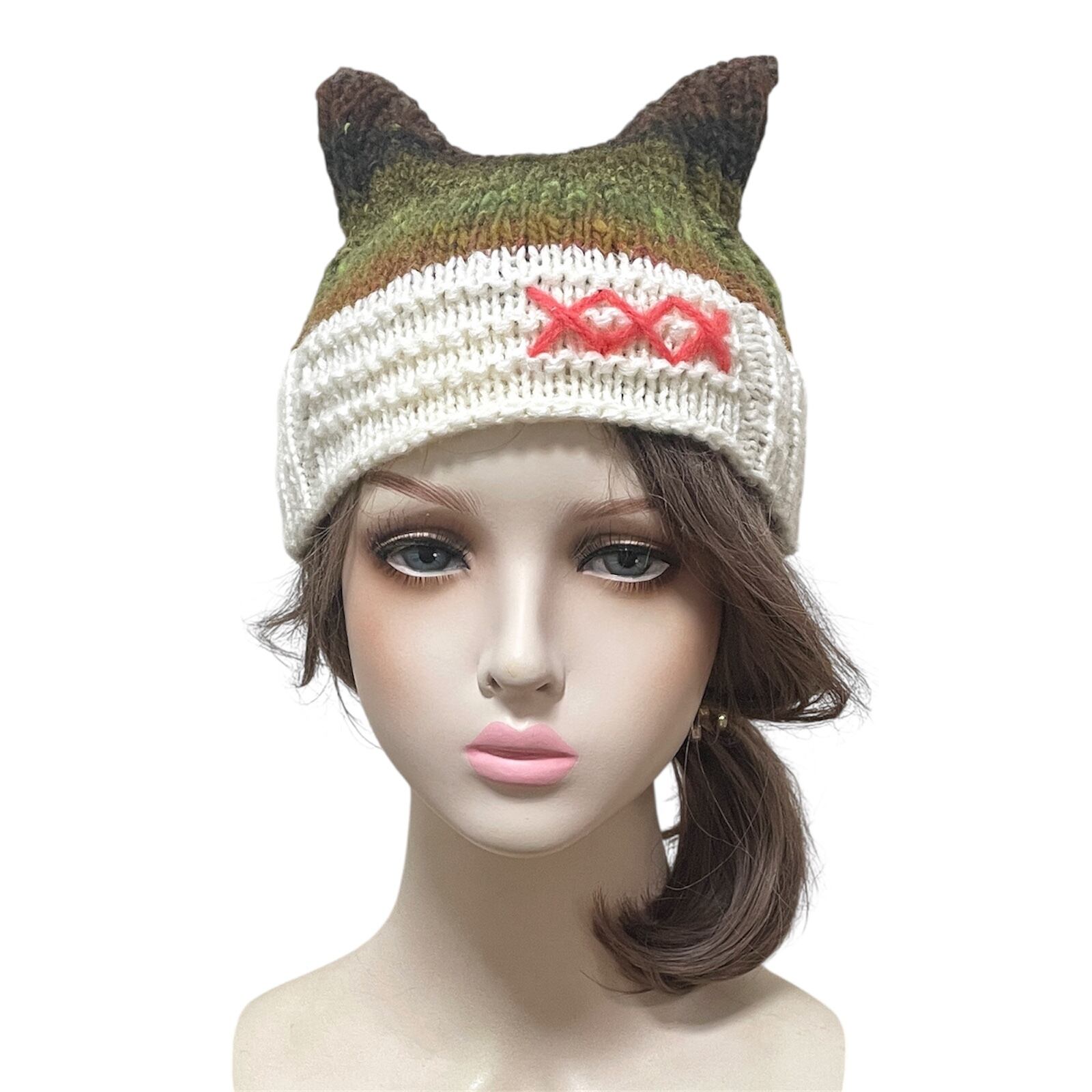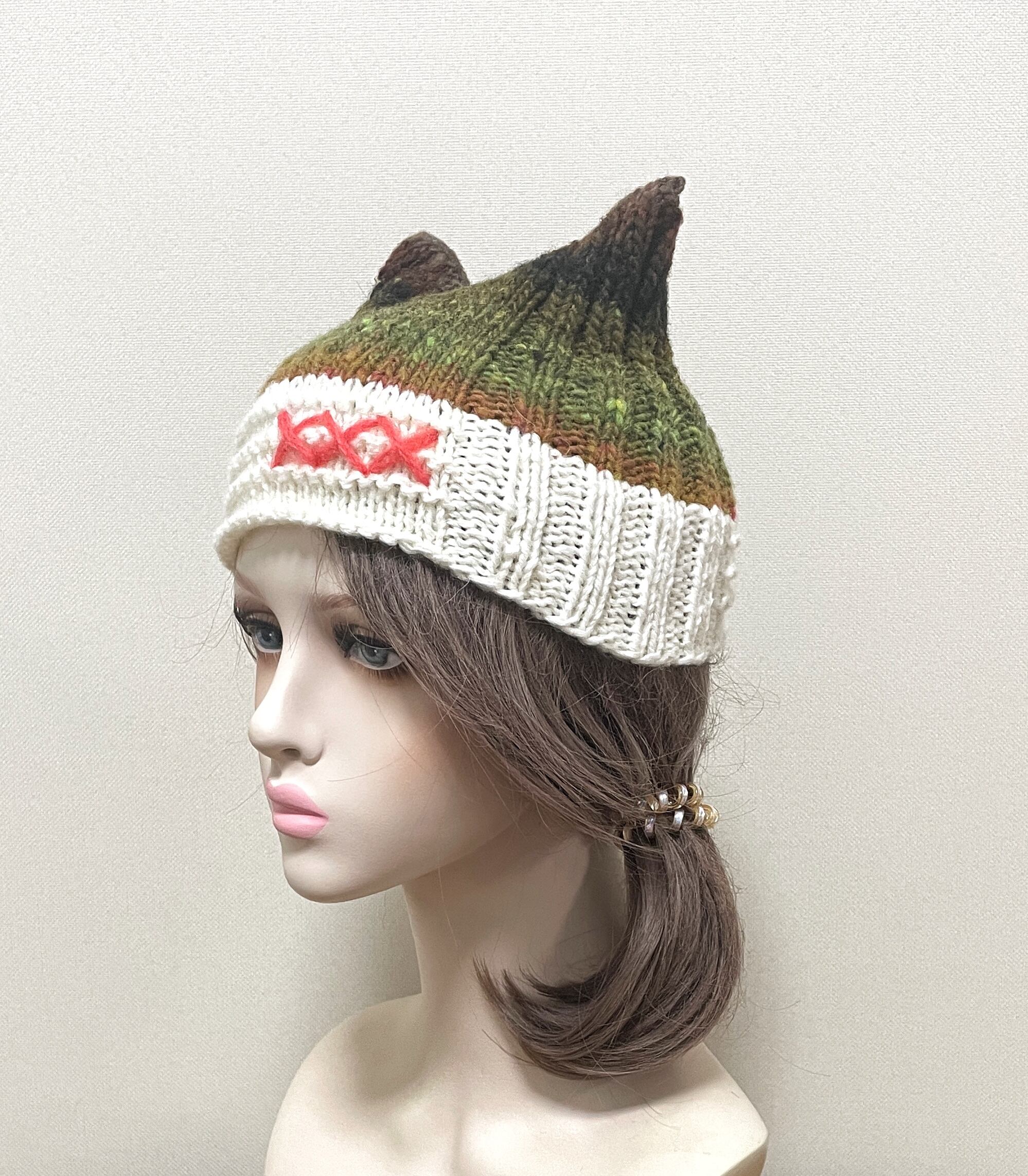 寒い日の外出に、さっと被れる猫耳ニット帽です。