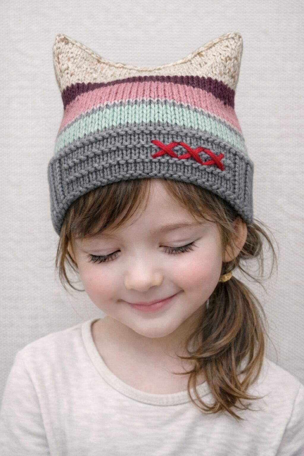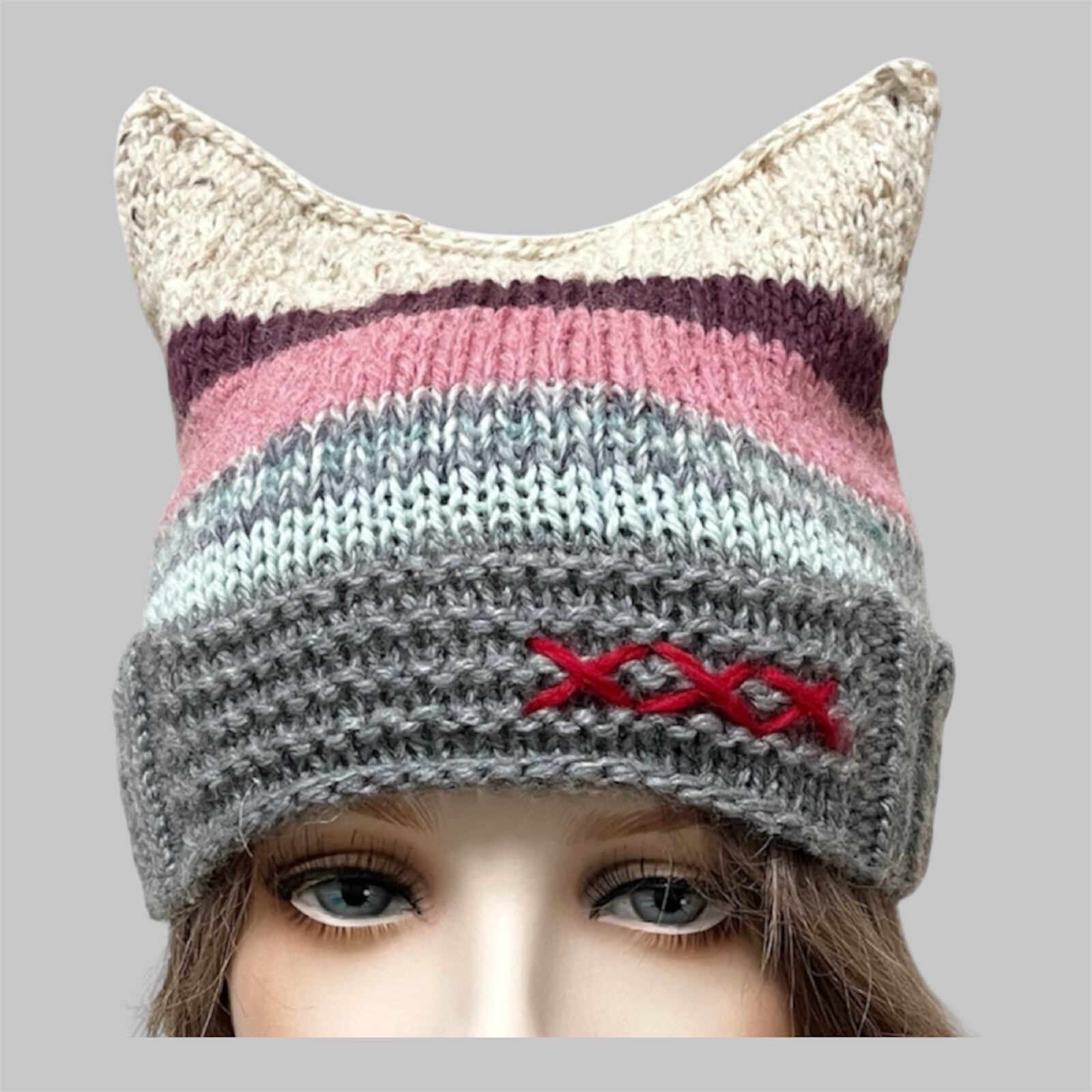 カラー :グレー×カラフルボーダー×ベビーベージュツィード耳(レッド+刺繍入り)