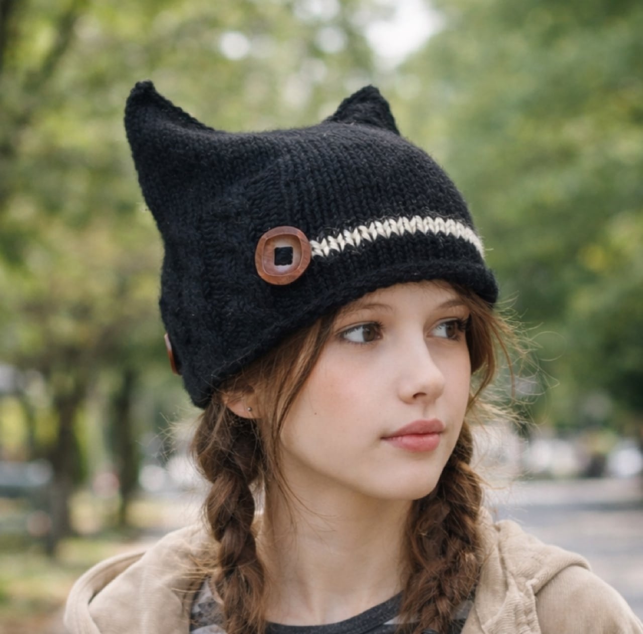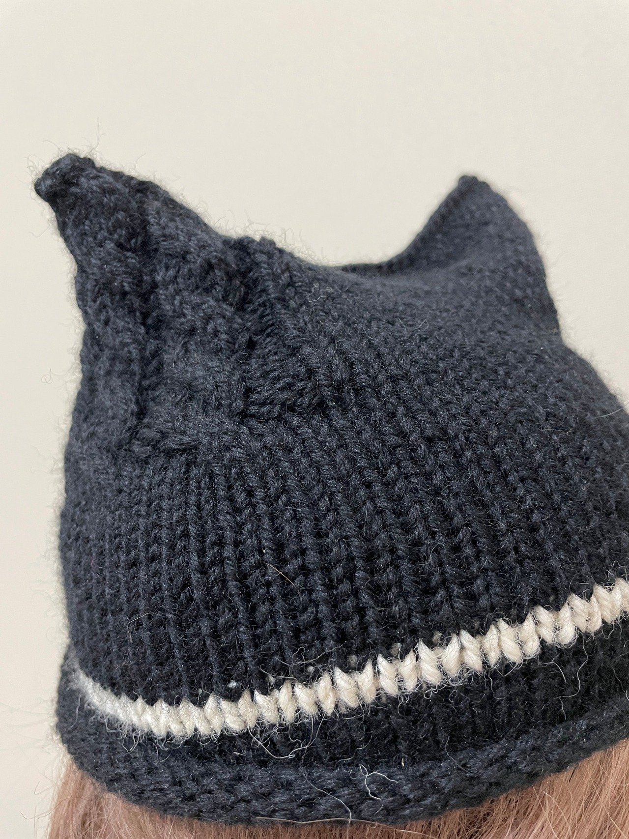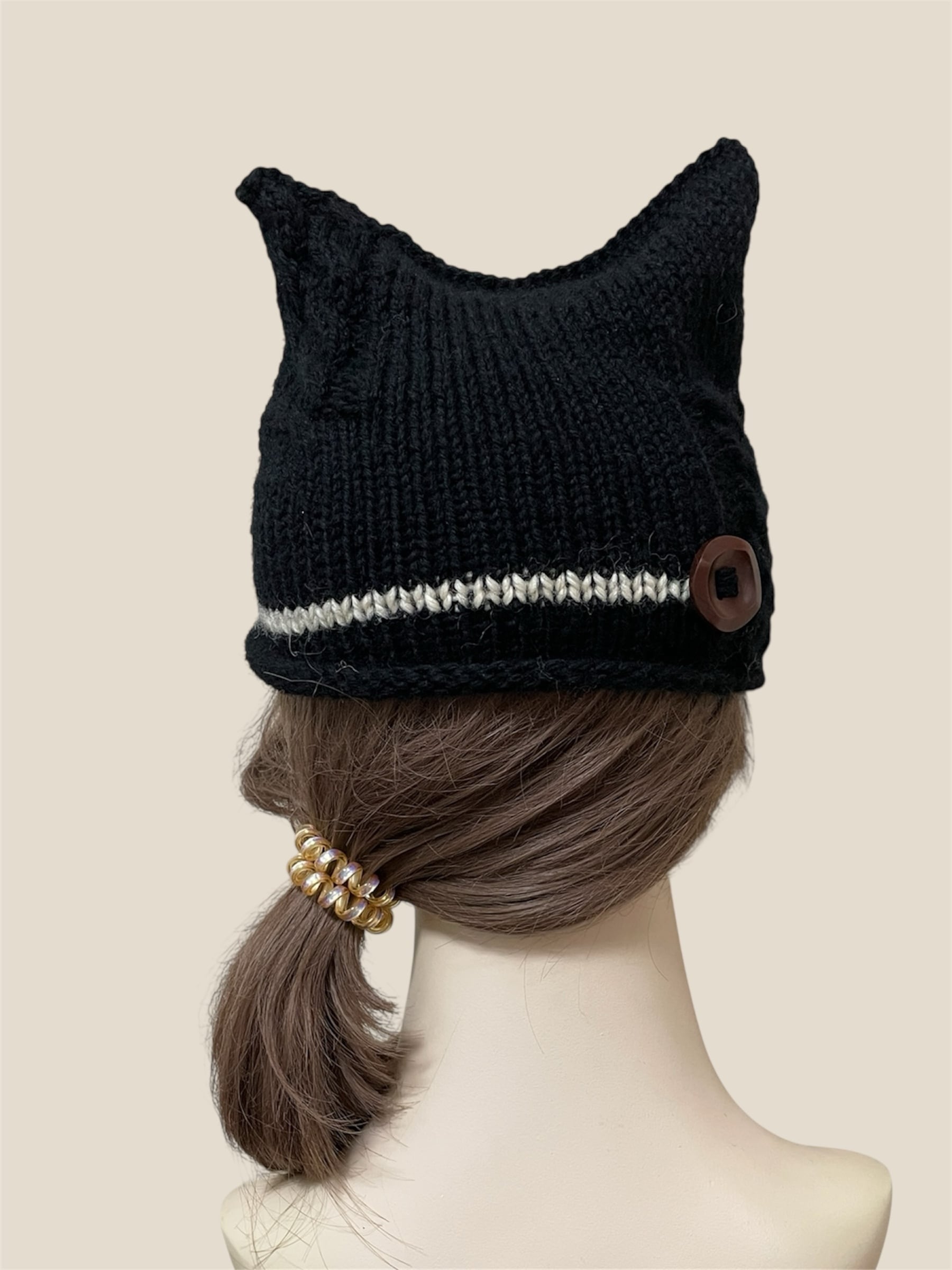 寒い日の外出に、さっと被れる猫耳ニット帽です。