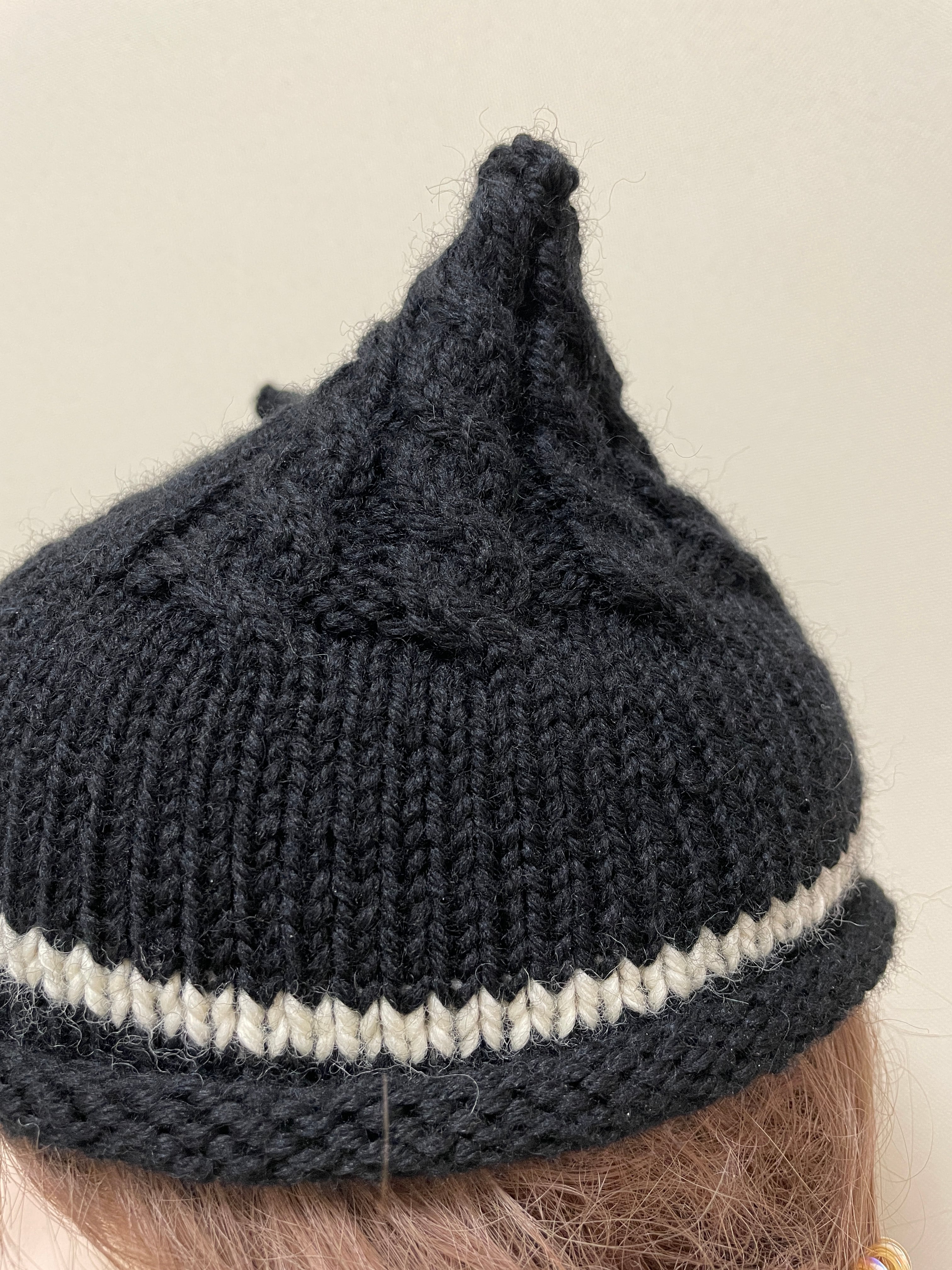 デザイン/ 左右、縄編みが違う位置に入っています。