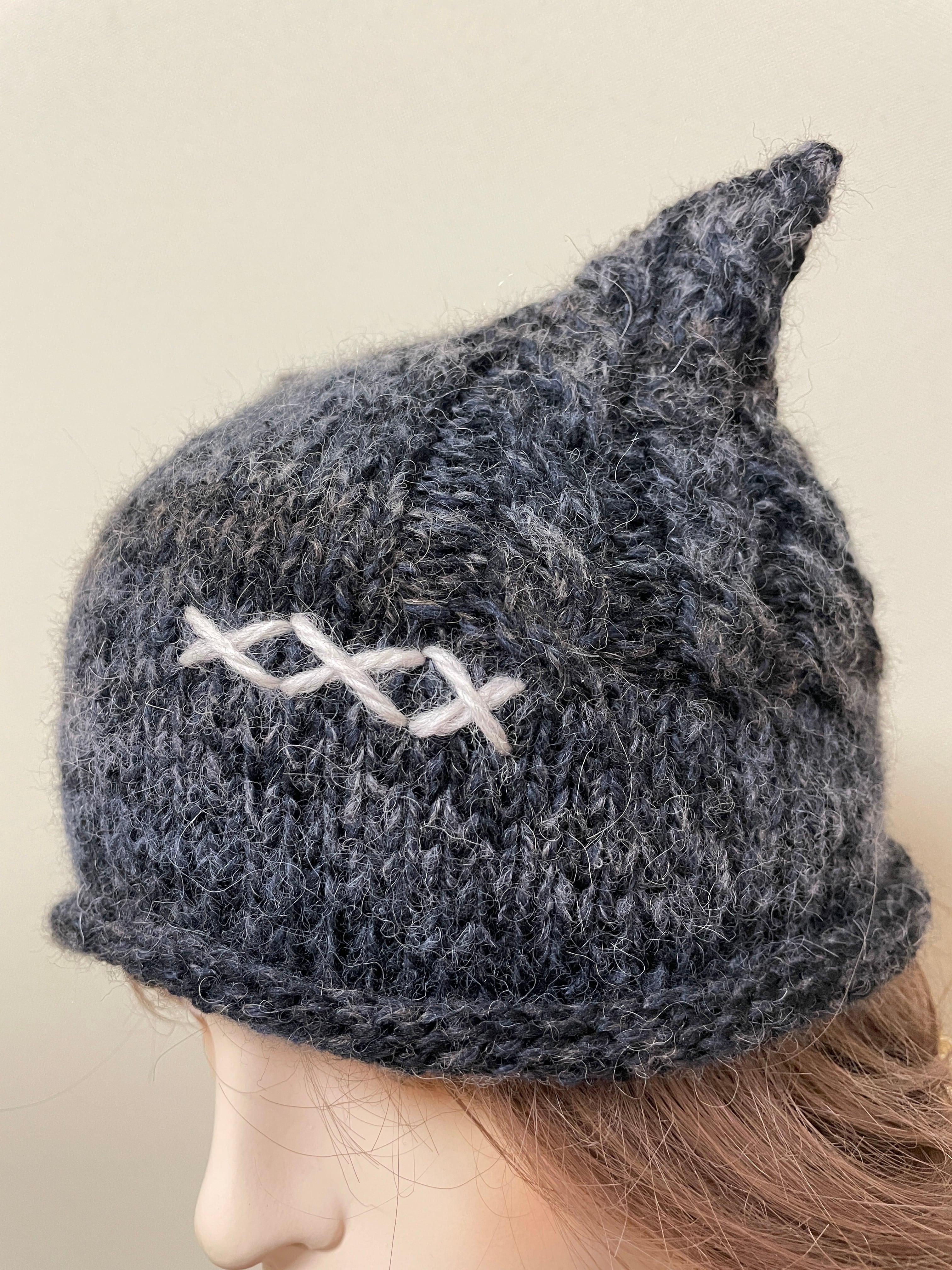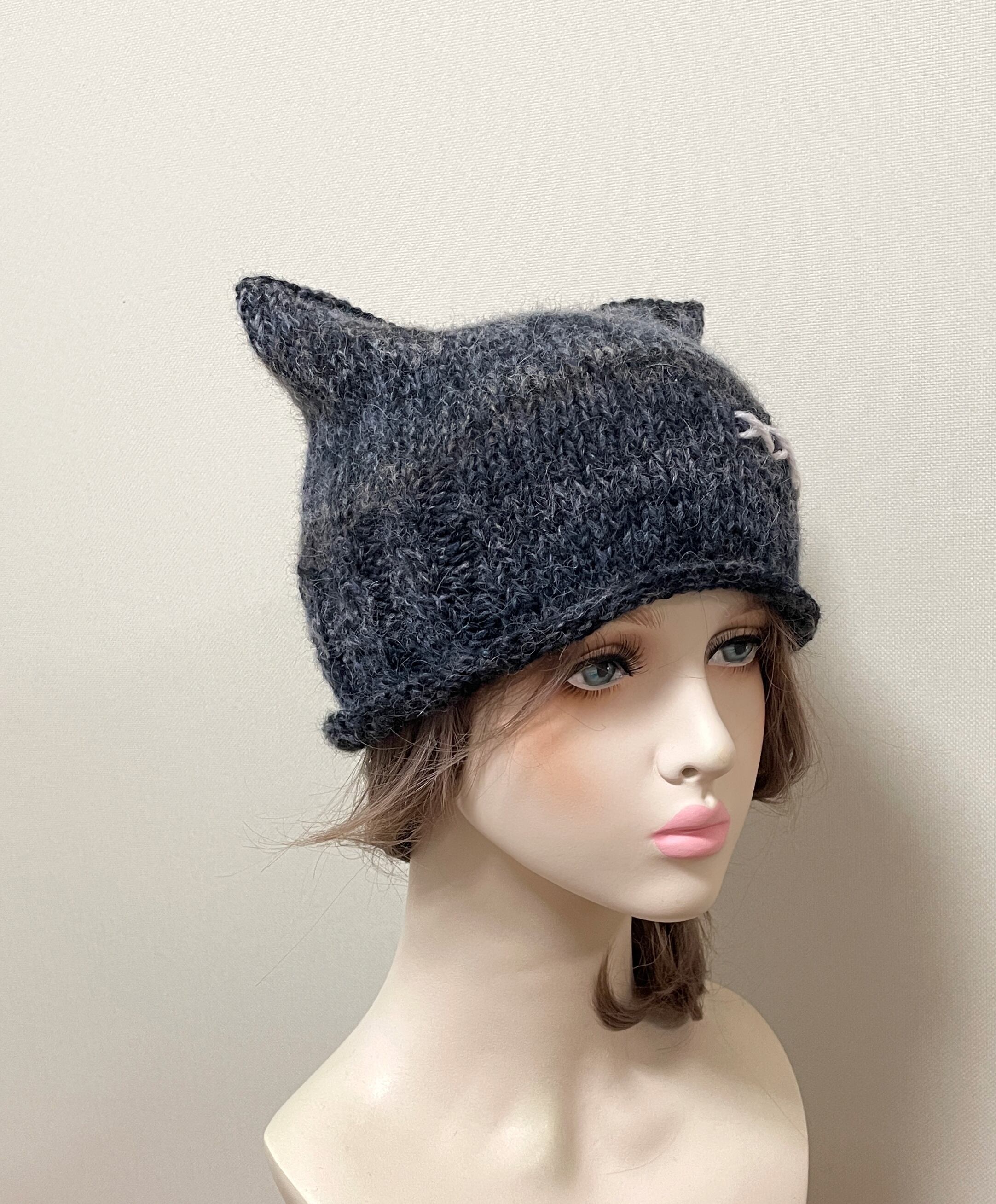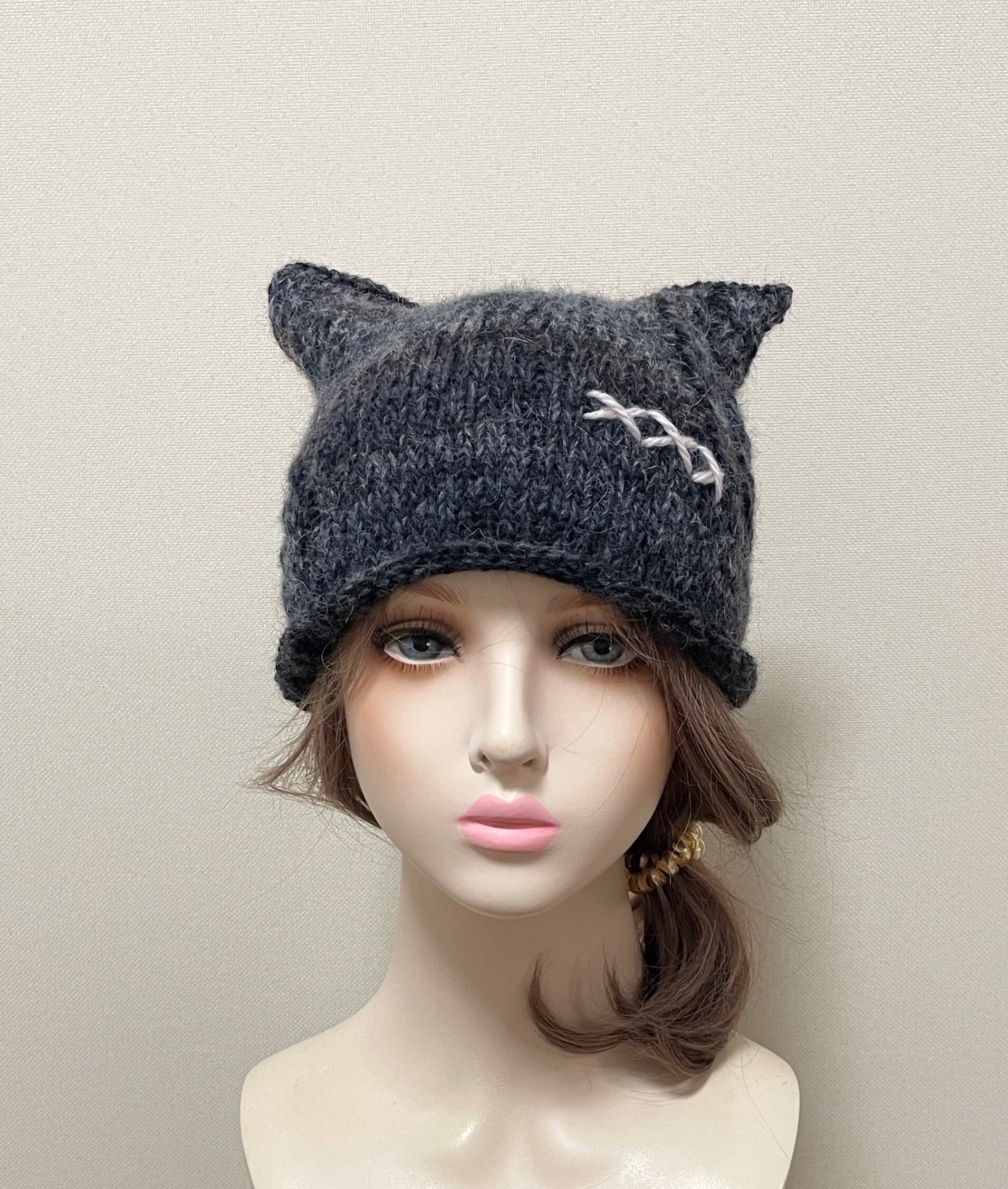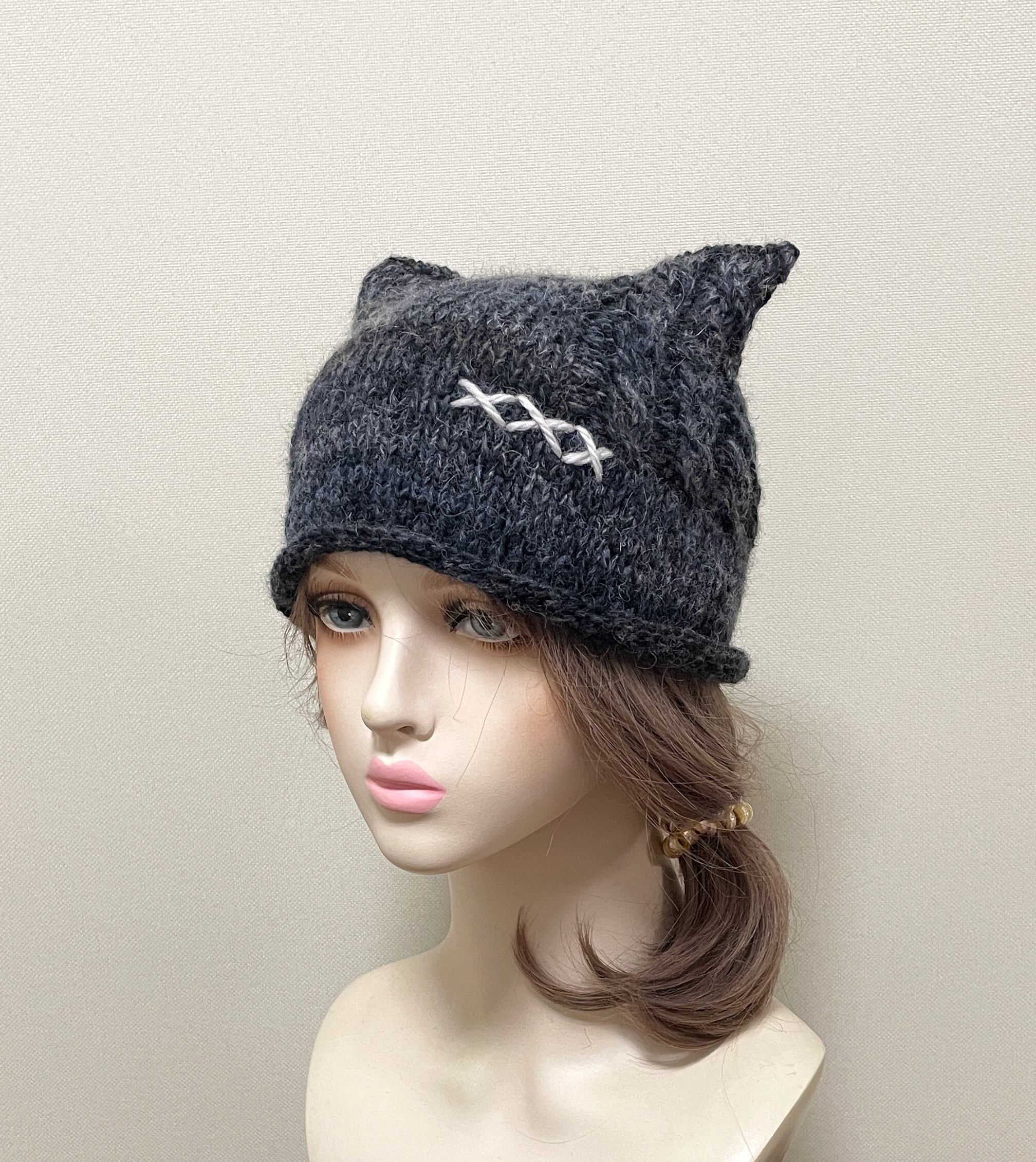 大人の服に自然になじむ、ユニセックスのネコ耳ニット帽です。