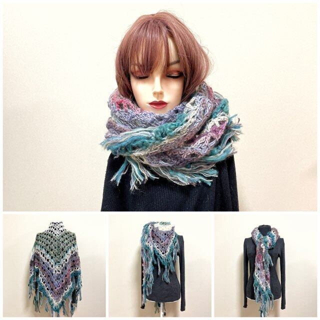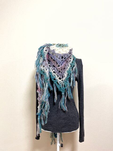 肌触りに拘り、カラフルに仕上げたふんわり柔らかく暖かい三角ストールです。