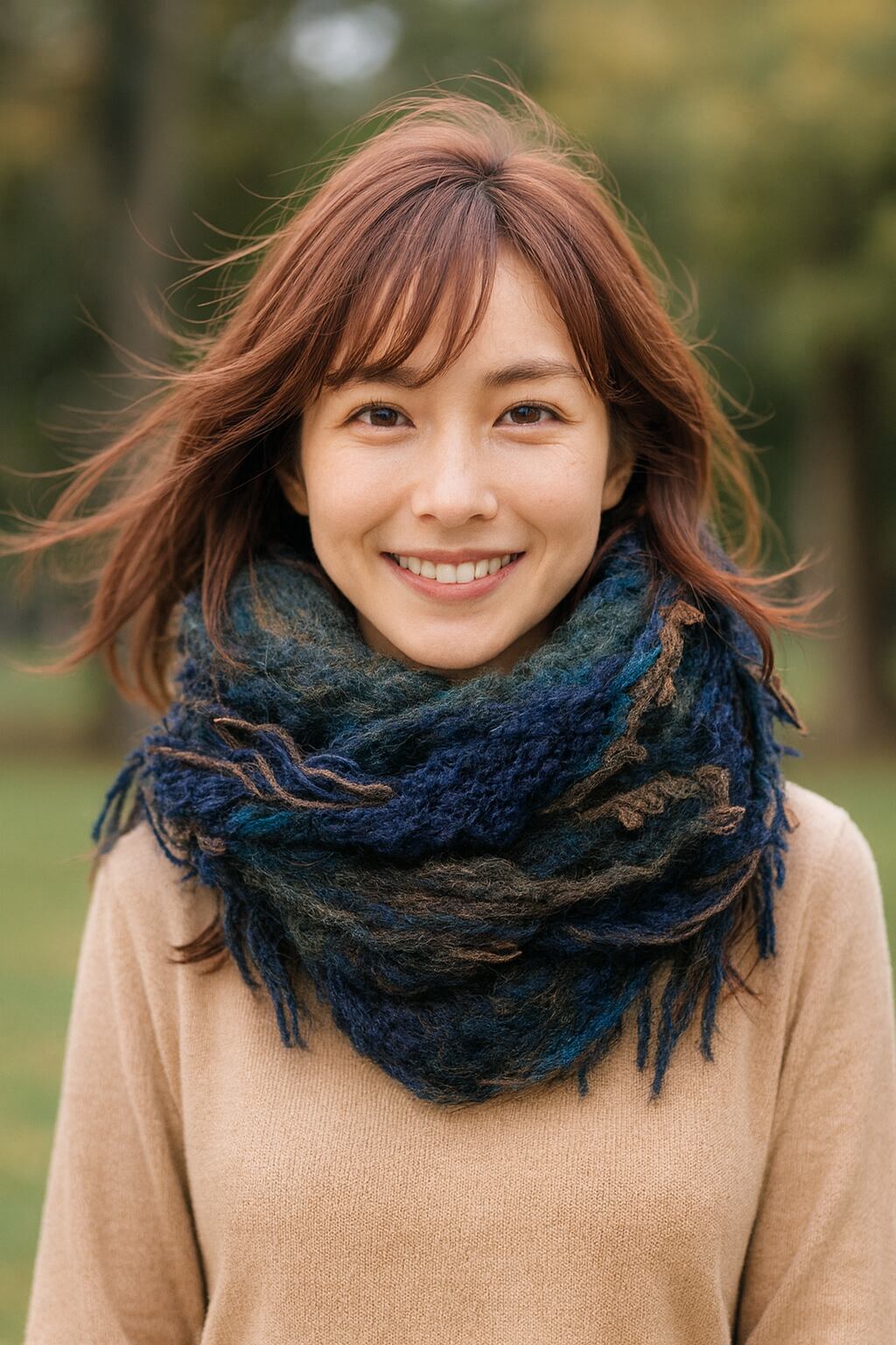 巻き方で表情が変わり、顔写りを明るくしてくれます。アクセントカラーを生かした落ち着いた配色で、様々なファッションに合わせやすいです。