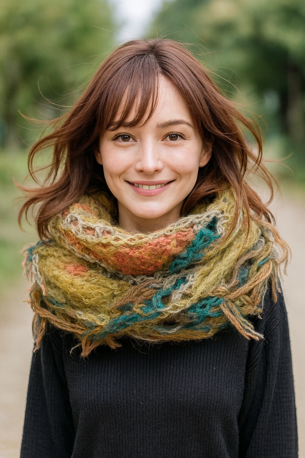 巻き方で表情が変わり、顔写りを明るくしてくれます。アクセントカラーを生かした落ち着いた配色で、様々なファッションに合わせやすいです。