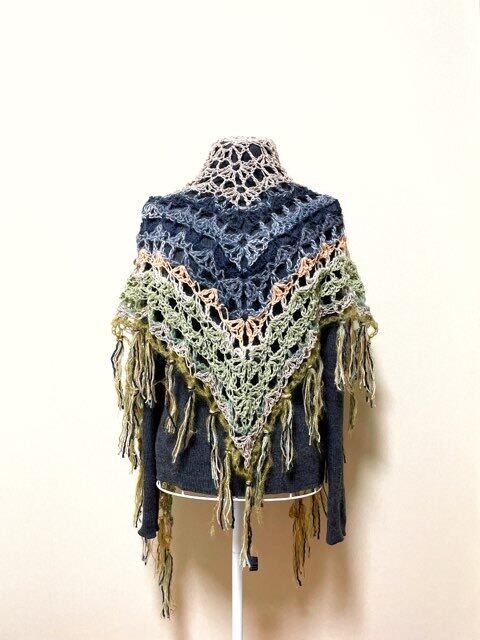 チクチクしにくい素材を組み合わせたカラフルな三角ストールです。