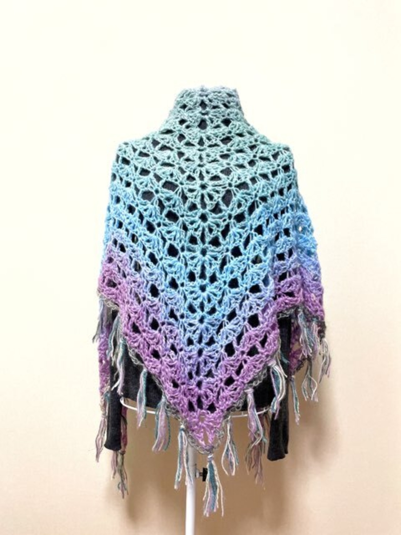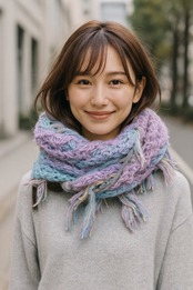 チクチクしにくい素材を組み合わせたカラフルな三角ストールです。