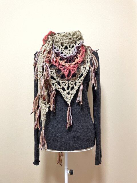 チクチクしにくい素材を組み合わせたカラフルな三角ストールです。