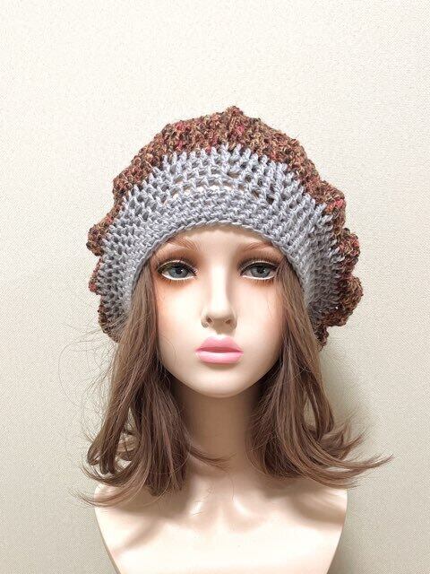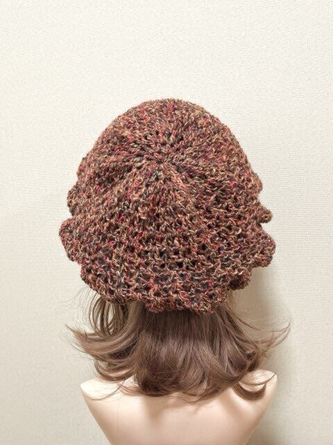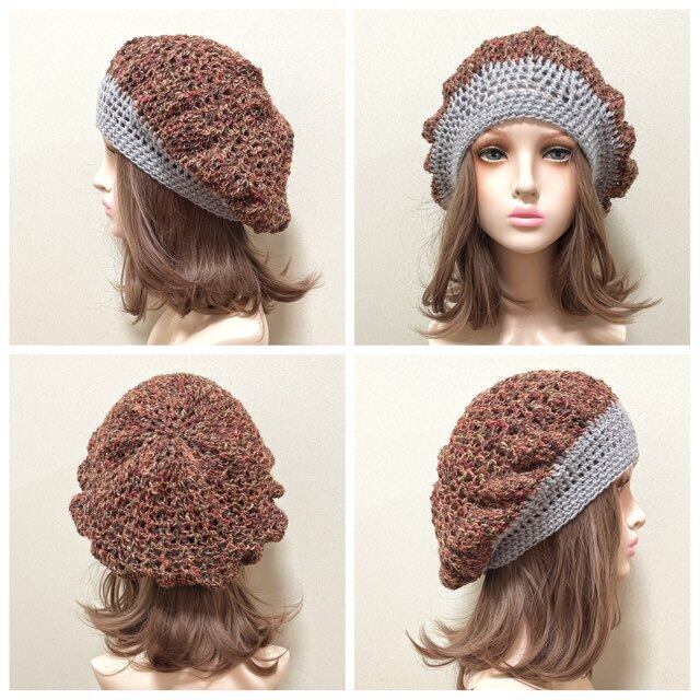細い冬糸と春糸を使用しています。網模様なので、通気性は良いです。ゆったり被れます。